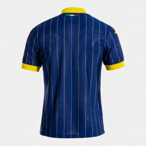 Come da tradizione, i Gialloblù continueranno a vestire i propri colori rappresentativi e distintivi ancora una volta nella prima divisa: il blu e il giallo. L’iconica maglia della stagione 84/85 è stata volutamente presa come spunto e arricchita con dettagli che omaggiano il Verona Campione. La maglia blu presenta delle pin stripes gialle molto sottili che si intersecano con il logo presente sul petto. Il crest con i due mastini, altra citazione della maglia dell’epoca, è realizzato in silicone ed è termo applicato sul cuore. Le righe gialle proseguono anche lungo le maniche della maglia, culminando con il polsino giallo. Nella parte posteriore, appena sotto il colletto, è presente il tricolore, per rendere omaggio all’unica squadra di una città non capoluogo di regione nella Serie A capace di vincere un campionato a girone unico. Ulteriore elemento di tributo è la patch posizionata nella parte interna del colletto, che recita “Gli unici nella storia. Campioni d’Italia 1984/85”.
