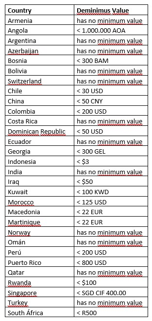 The minimum value indicates that, if the customer reaches that monetary amount in his order, it will be stopped in customs and will have to take charge of the corresponding payment that the customs offices require, provided that the amount is equal to or greater than that indicated in the table.